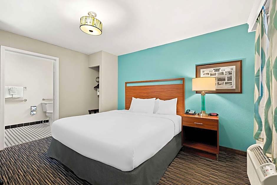 This room features a flat-screen TV, a coffeemaker and a private bathroom with a roll-in shower.